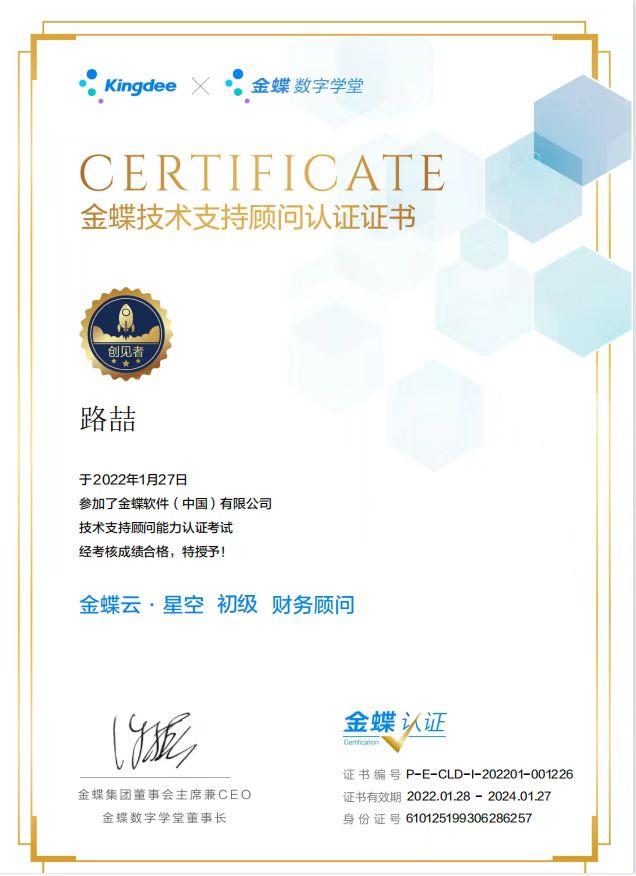 金蝶技术支持顾问认证证书